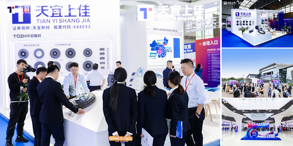 展會現(xiàn)場,天宜上佳精心設置了零距離產(chǎn)品品鑒區(qū),集中展示了核心產(chǎn)品長纖碳陶涂層制動盤、長纖碳陶制動盤和短纖碳陶制動盤等,這些產(chǎn)品不僅應用于新能源汽車,還適用在高鐵、地鐵、飛機、商用車等多場景領域;展區(qū)還特別設置了碳陶盤在高溫下防氧化燒蝕性能對比展示,凸顯在1000℃高溫工況下的盤基體碳纖維無氧化燒蝕的優(yōu)異表現(xiàn)。憑借先進的技術工藝與過硬的產(chǎn)品實力,天宜上佳展位吸引了眾多國內外客戶、同行的高度關注,并就技術細節(jié)與合作推廣進行了深入探討。