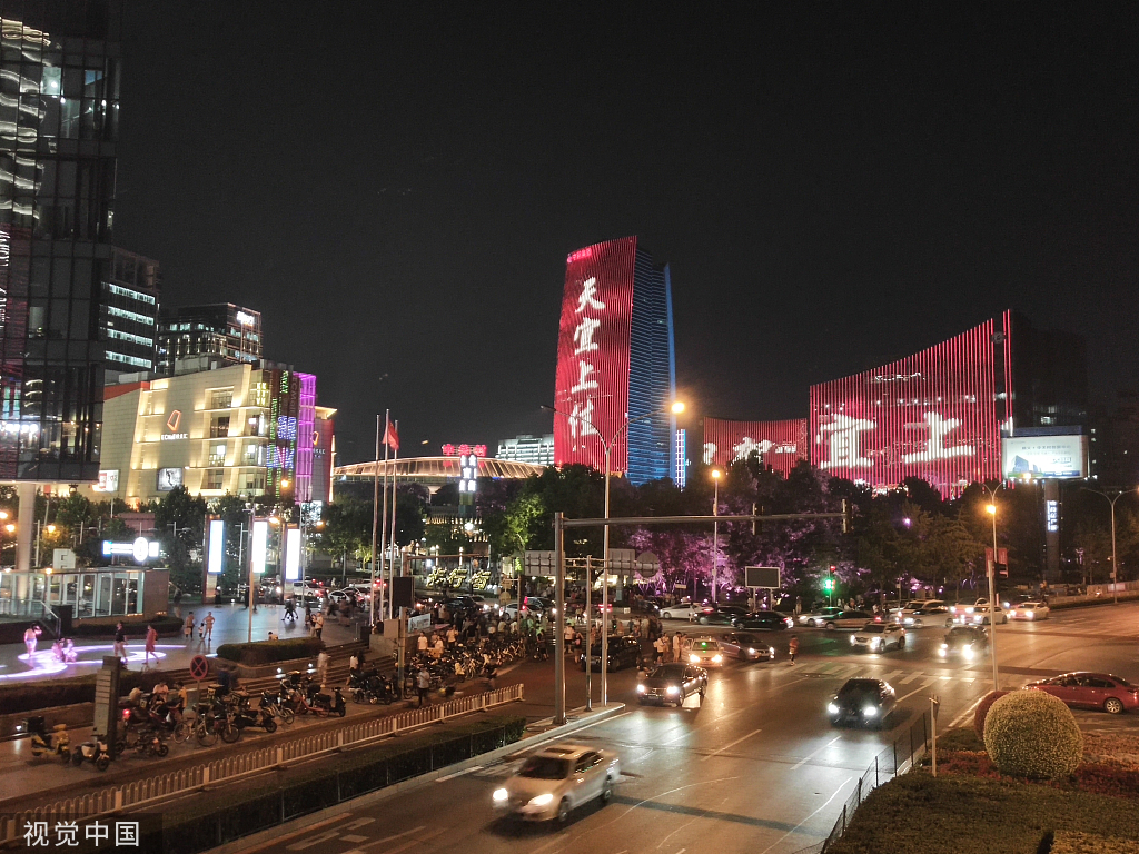 2019年7月21日,北京,中關(guān)村(中關(guān)村E世界和中關(guān)村中鋼國際廣場)亮起樓宇燈光秀——“海淀區(qū)祝賀‘天宜上佳’‘航天宏圖’首批登陸上交所科創(chuàng)板”。